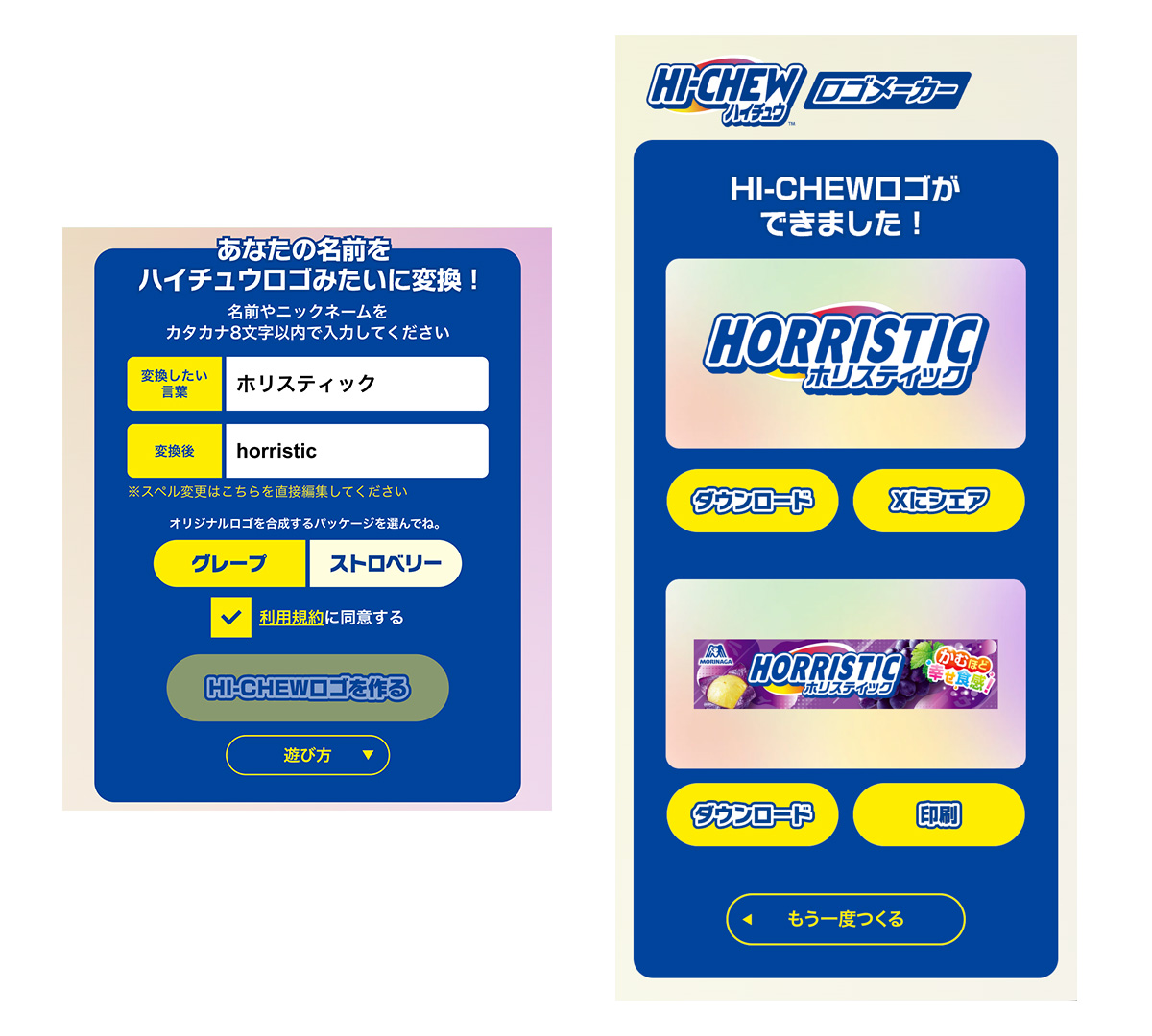 森永製菓がソフトキャンディ「ハイチュウ」のロゴをカタカナから英語表記「HI-CHEW」にリニューアル。新しいロゴの認知・浸透を図り、名前や好きな言葉をハイチュウロゴに変換できる「HI-CHEWロゴメーカー」の特設サイトを制作しました。オリジナルロゴはSNSのアイコンや写真のデコレーションなど、様々な用途に使うことができます。